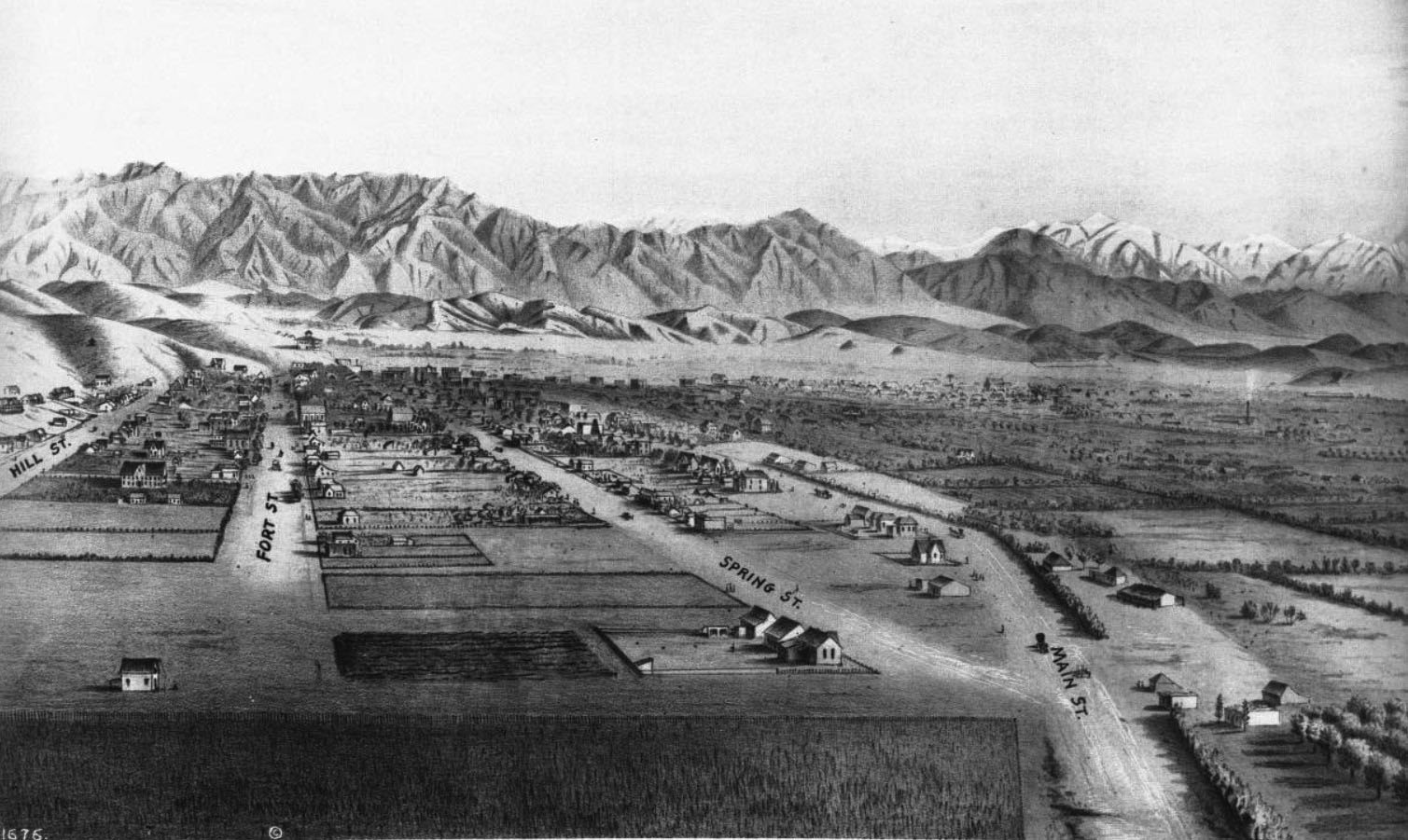 Caption of the photo: (ca. 1873)* – Panoramic sketch looking north toward downtown Los Angeles showing mostly undeveloped land.  At lower-right can be seen the junction of Main and Spring streets at a point where 9th Street will one day intersect.  Hill Street and Fort Street (later Broadway) are on the left.  The Verdugo Hills and snow-capped San Gabriel Mountains can be seen in the distance. Photo of a lithograph, courtesy of the California Historical Society.